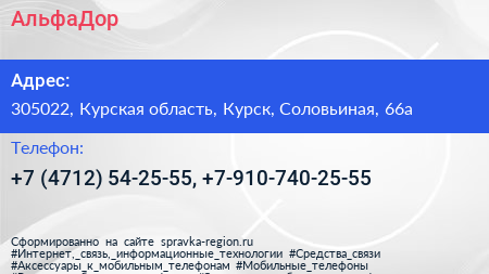 АльфаДор по адресу 305022, Курская область, Курск, Соловьиная, 66а в дальнейшем Организация, размещена в следующих категориях: