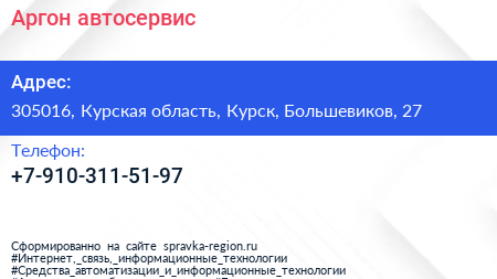 Аргон, автосервис по адресу 305016, Курская область, Курск, Большевиков, 27 в дальнейшем Организация, размещена в следующих категориях: