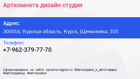 Арткомната, дизайн-студия по адресу 305016, Курская область, Курск, Щемиловка, 105 в дальнейшем Организация, размещена в следующих категориях: