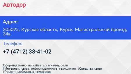 Автодор по адресу 305025, Курская область, Курск, Магистральный проезд, 34а в дальнейшем Организация, размещена в следующих категориях: