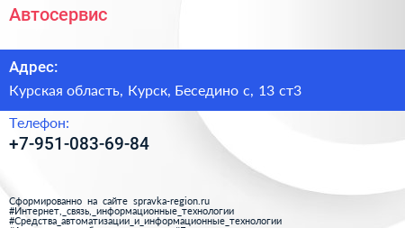 Автосервис по адресу Курская область, Курск, Беседино с, 13 ст3 в дальнейшем Организация, размещена в следующих категориях:
