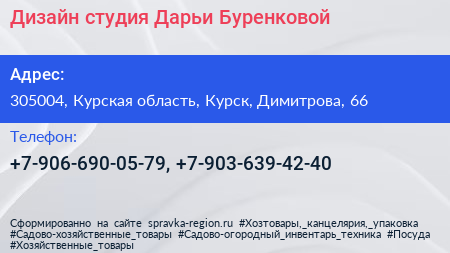 Дизайн-студия Дарьи Буренковой по адресу 305004, Курская область, Курск, Димитрова, 66 в дальнейшем Организация, размещена в следующих категориях: