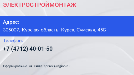 ЭЛЕКТРОСТРОЙМОНТАЖ по адресу 305007, Курская область, Курск, Сумская, 45Б в дальнейшем Организация, размещена в следующих категориях: