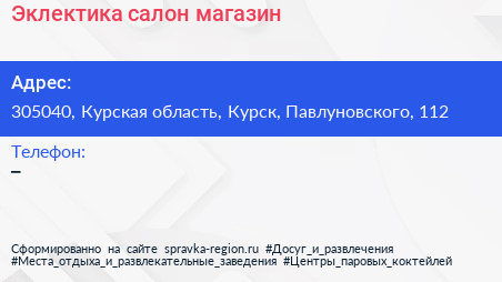 Эклектика, салон-магазин по адресу 305040, Курская область, Курск, Павлуновского, 112 в дальнейшем Организация, размещена в следующих категориях:
