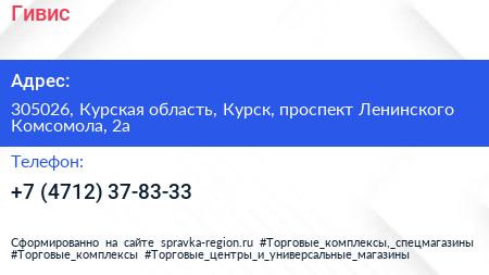 Гивис по адресу 305026, Курская область, Курск, проспект Ленинского Комсомола, 2а в дальнейшем Организация, размещена в следующих категориях: