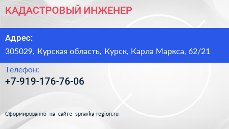 КАДАСТРОВЫЙ ИНЖЕНЕР по адресу 305029, Курская область, Курск, Карла Маркса, 62/21 в дальнейшем Организация, размещена в следующих категориях: