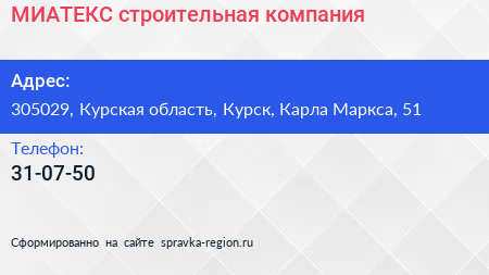 МИАТЕКС, строительная компания по адресу 305029, Курская область, Курск, Карла Маркса, 51 в дальнейшем Организация, размещена в следующих категориях: