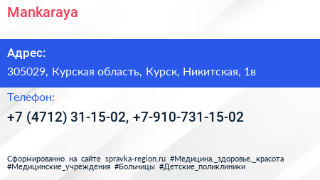 Mankaraya по адресу 305029, Курская область, Курск, Никитская, 1в в дальнейшем Организация, размещена в следующих категориях: