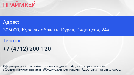 ПРАЙМКЕЙ по адресу 305000, Курская область, Курск, Радищева, 24а в дальнейшем Организация, размещена в следующих категориях: