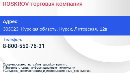 ROSKROV, торговая компания по адресу 305023, Курская область, Курск, Литовская, 12в в дальнейшем Организация, размещена в следующих категориях: