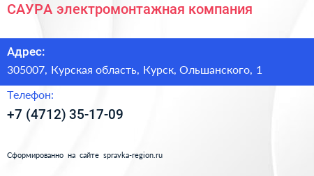 САУРА, электромонтажная компания по адресу 305007, Курская область, Курск, Ольшанского, 1 в дальнейшем Организация, размещена в следующих категориях: