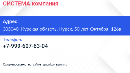 СИСТЕМА, компания по адресу 305040, Курская область, Курск, 50 лет Октября, 126в в дальнейшем Организация, размещена в следующих категориях: