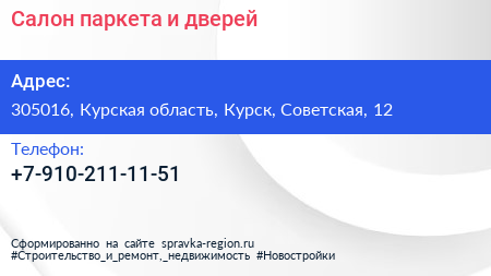Салон паркета и дверей по адресу 305016, Курская область, Курск, Советская, 12 в дальнейшем Организация, размещена в следующих категориях: