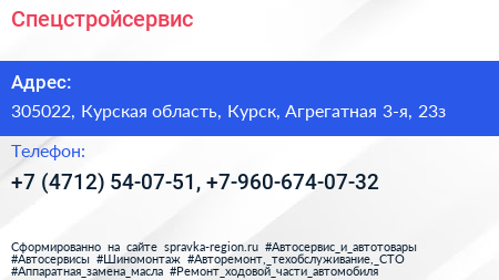 Спецстройсервис по адресу 305022, Курская область, Курск, Агрегатная 3-я, 23з в дальнейшем Организация, размещена в следующих категориях:
