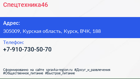 Спецтехника46 по адресу 305009, Курская область, Курск, ВЧК, 188 в дальнейшем Организация, размещена в следующих категориях: