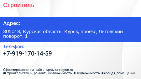 Строитель по адресу 305018, Курская область, Курск, проезд Льговский поворот, 1 в дальнейшем Организация, размещена в следующих категориях: