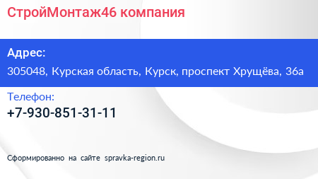 СтройМонтаж46, компания по адресу 305048, Курская область, Курск, проспект Хрущёва, 36а в дальнейшем Организация, размещена в следующих категориях: