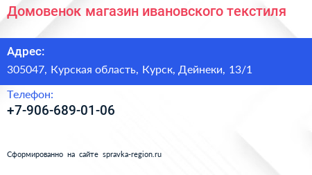 Домовенок, магазин ивановского текстиля по адресу 305047, Курская область, Курск, Дейнеки, 13/1 в дальнейшем Организация, размещена в следующих категориях: