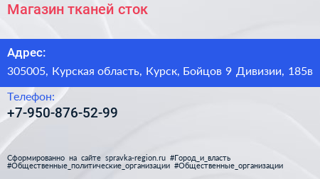 Магазин тканей-сток по адресу 305005, Курская область, Курск, Бойцов 9 Дивизии, 185в в дальнейшем Организация, размещена в следующих категориях: