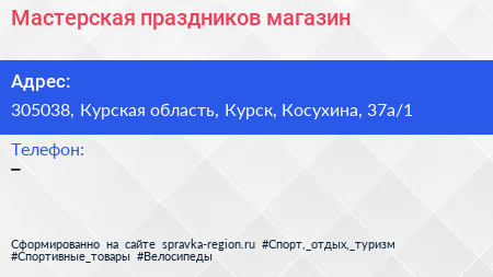 Мастерская праздников, магазин по адресу 305038, Курская область, Курск, Косухина, 37а/1 в дальнейшем Организация, размещена в следующих категориях: