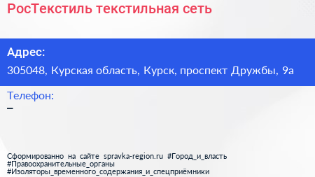 РосТекстиль, текстильная сеть по адресу 305048, Курская область, Курск, проспект Дружбы, 9а в дальнейшем Организация, размещена в следующих категориях: