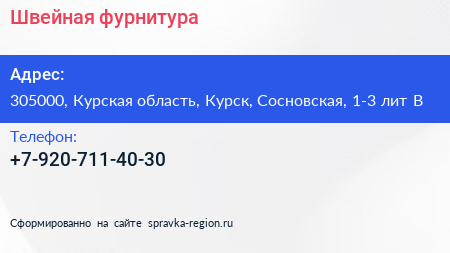 Швейная фурнитура по адресу 305000, Курская область, Курск, Сосновская, 1-3 лит В в дальнейшем Организация, размещена в следующих категориях: