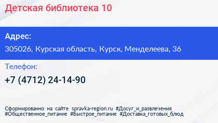 Детская библиотека №10 по адресу 305026, Курская область, Курск, Менделеева, 36 в дальнейшем Организация, размещена в следующих категориях:
