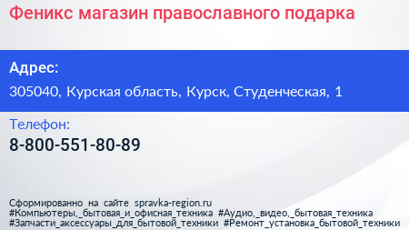 Феникс, магазин православного подарка по адресу 305040, Курская область, Курск, Студенческая, 1 в дальнейшем Организация, размещена в следующих категориях: