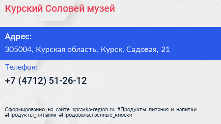 Курский Соловей, музей по адресу 305004, Курская область, Курск, Садовая, 21 в дальнейшем Организация, размещена в следующих категориях: