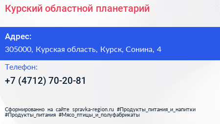 Курский областной планетарий по адресу 305000, Курская область, Курск, Сонина, 4 в дальнейшем Организация, размещена в следующих категориях: