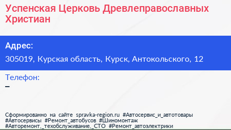 Успенская Церковь Древлеправославных Христиан по адресу 305019, Курская область, Курск, Антокольского, 12 в дальнейшем Организация, размещена в следующих категориях: