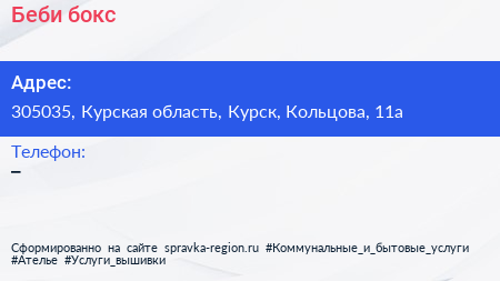 Беби-бокс по адресу 305035, Курская область, Курск, Кольцова, 11а в дальнейшем Организация, размещена в следующих категориях: