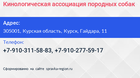 Кинологическая ассоциация породных собак по адресу 305001, Курская область, Курск, Гайдара, 11 в дальнейшем Организация, размещена в следующих категориях: