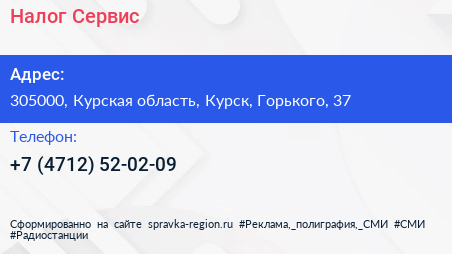 Налог-Сервис по адресу 305000, Курская область, Курск, Горького, 37 в дальнейшем Организация, размещена в следующих категориях: