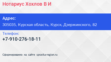 Нотариус Хохлов В.И. по адресу 305035, Курская область, Курск, Дзержинского, 82 в дальнейшем Организация, размещена в следующих категориях: