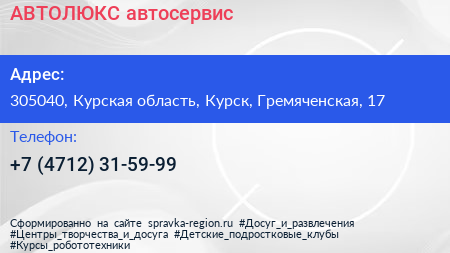 АВТОЛЮКС, автосервис по адресу 305040, Курская область, Курск, Гремяченская, 17 в дальнейшем Организация, размещена в следующих категориях: