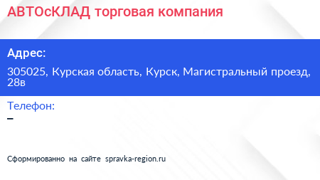 АВТОсКЛАД, торговая компания по адресу 305025, Курская область, Курск, Магистральный проезд, 28в в дальнейшем Организация, размещена в следующих категориях: