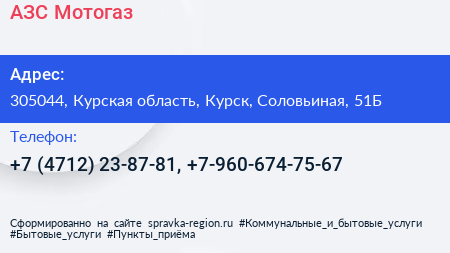 АЗС Мотогаз по адресу 305044, Курская область, Курск, Соловьиная, 51Б в дальнейшем Организация, размещена в следующих категориях: