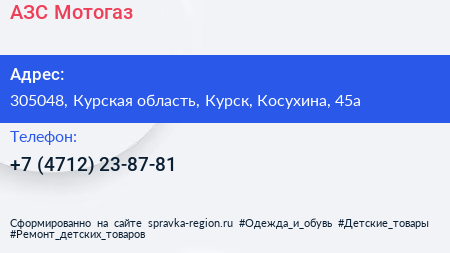 АЗС Мотогаз по адресу 305048, Курская область, Курск, Косухина, 45а в дальнейшем Организация, размещена в следующих категориях: