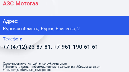АЗС Мотогаз по адресу Курская область, Курск, Елисеева, 2 в дальнейшем Организация, размещена в следующих категориях:
