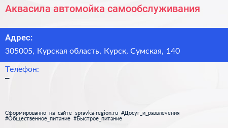 Аквасила, автомойка самообслуживания по адресу 305005, Курская область, Курск, Сумская, 140 в дальнейшем Организация, размещена в следующих категориях: