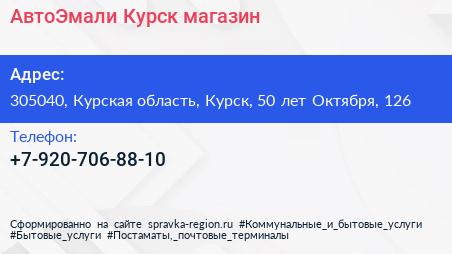 АвтоЭмали Курск, магазин по адресу 305040, Курская область, Курск, 50 лет Октября, 126 в дальнейшем Организация, размещена в следующих категориях: