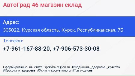 АвтоГрад-46, магазин-склад по адресу 305022, Курская область, Курск, Республиканская, 7Б в дальнейшем Организация, размещена в следующих категориях: