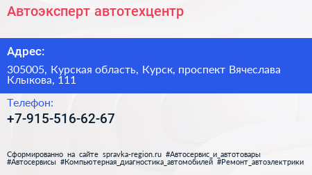 Автоэксперт, автотехцентр по адресу 305005, Курская область, Курск, проспект Вячеслава Клыкова, 111 в дальнейшем Организация, размещена в следующих категориях: