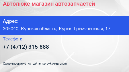 Автолюкс, магазин автозапчастей по адресу 305040, Курская область, Курск, Гремяченская, 17 в дальнейшем Организация, размещена в следующих категориях: