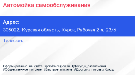 Автомойка самообслуживания по адресу 305022, Курская область, Курск, Рабочая 2-я, 23/6 в дальнейшем Организация, размещена в следующих категориях: