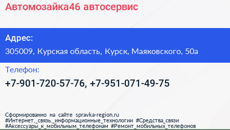 Автомозайка46, автосервис по адресу 305009, Курская область, Курск, Маяковского, 50а в дальнейшем Организация, размещена в следующих категориях: