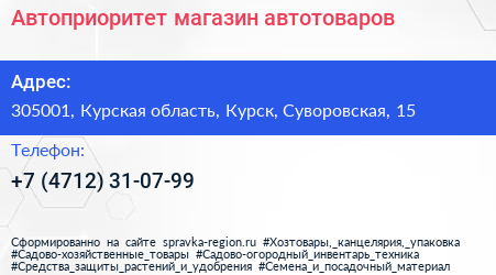Автоприоритет, магазин автотоваров по адресу 305001, Курская область, Курск, Суворовская, 15 в дальнейшем Организация, размещена в следующих категориях: