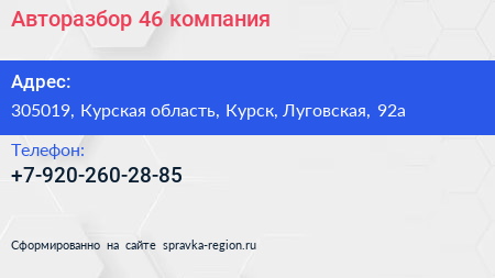 Авторазбор 46, компания по адресу 305019, Курская область, Курск, Луговская, 92а в дальнейшем Организация, размещена в следующих категориях: