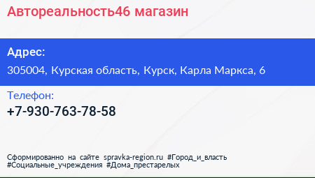 Автореальность46, магазин по адресу 305004, Курская область, Курск, Карла Маркса, 6 в дальнейшем Организация, размещена в следующих категориях: